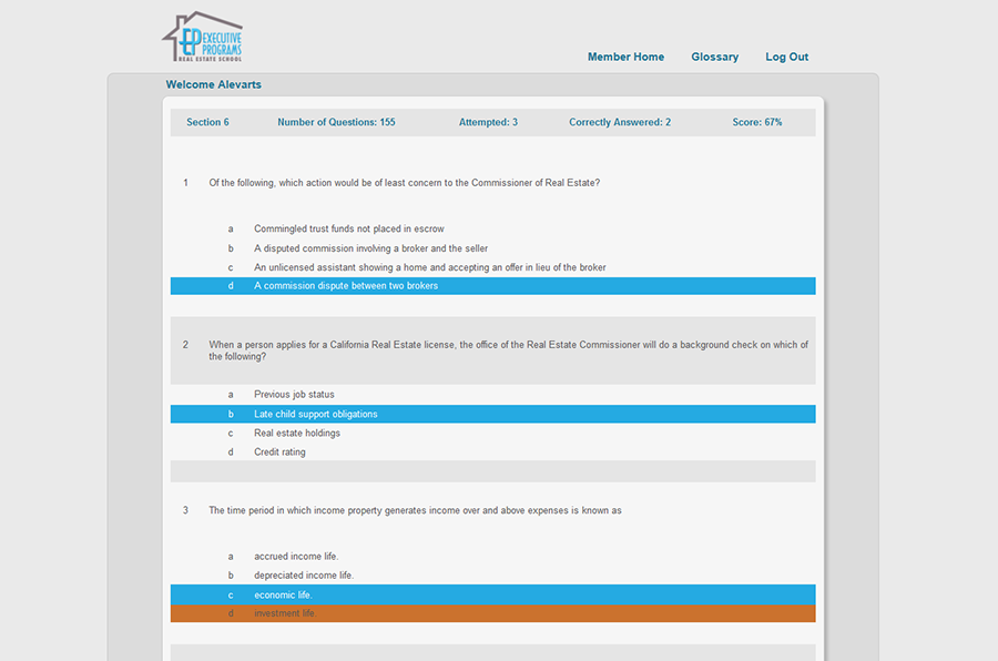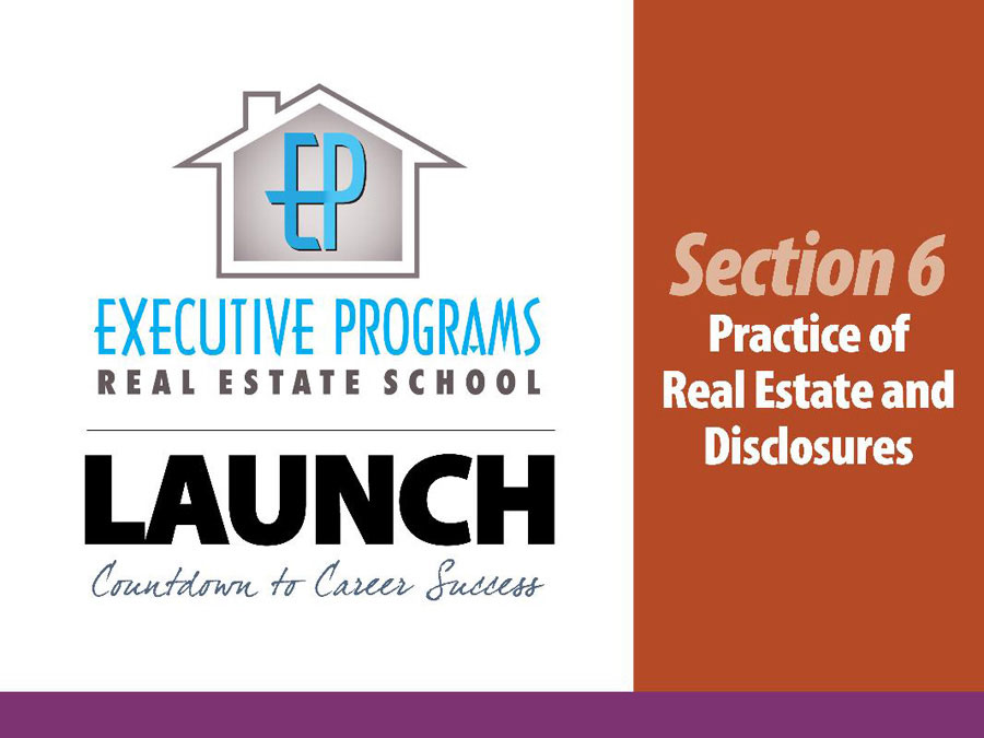 Disclaimer: Executive Programs Real Estate School refrains from any unauthorized reproduction of any portion of the actual Bureau of Real Estate license examinations. No materials were improperly removed from any actual license examination. All instructional materials are written and copyrighted by, and are the property of Executive Programs Real Estate School, and are used for the sole purpose of education and training.